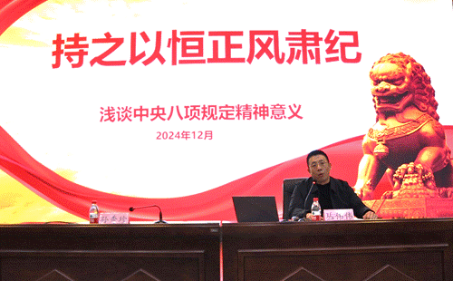 为切实提升党员干部的纪律规矩意识,推动落实中央八项规定及其实施细则精神化风成俗、成为自觉,深入推进全面从严治党向纵深发展,1213日,鞍山职业技术学院召开中央八项规定精神专题廉政教育会议,邀请鞍山市纪委监委党风政风监督室副主任丛伟伟围绕中央八项规定精神为党员干部作专题辅导。会议由学院党委委员、纪委书记(监察专员)孙秀珍主持。